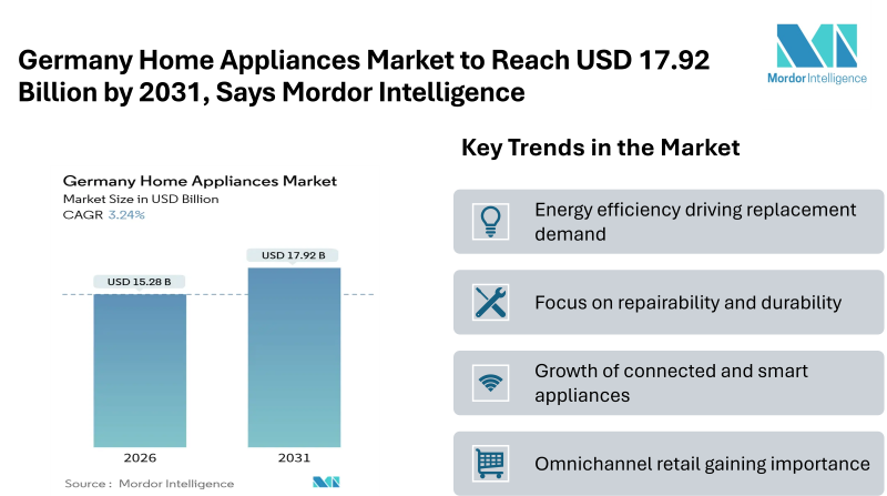 According to Mordor Intelligence, the Germany home appliances market size is estimated at USD 15.28 billion in 2026 and is expected to reach USD 17.92 billion by 2031, growing at a CAGR of 3.24%. This growth reflects a shift in purchasing behavior where energy efficiency and long-term usability are becoming more important than simple replacement needs. The market is entering a steady phase of transformation supported by policy-led replacement cycles and changing consumer expectations.